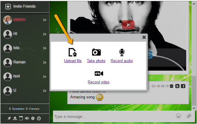 RumbleTalk group chat includes a simple file sharing feature to allow online communities to send most kinds of documents including the most popular Word, Excel, PowerPoint and .pdfs.