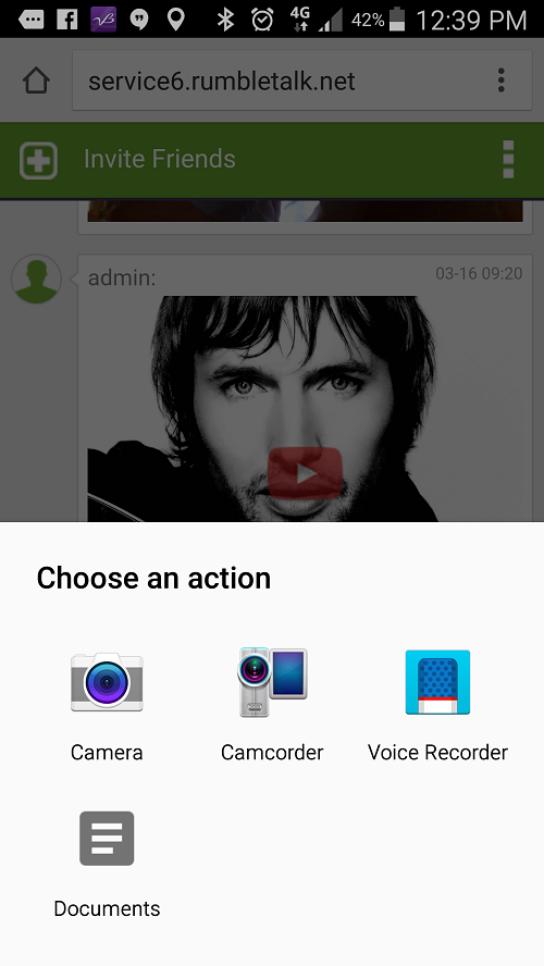 While logged into a RumbleTalk group chat from a mobile device, click on the paperclip icon at the bottom of the window. After choosing the document button you will have access to the available files on your phone.
