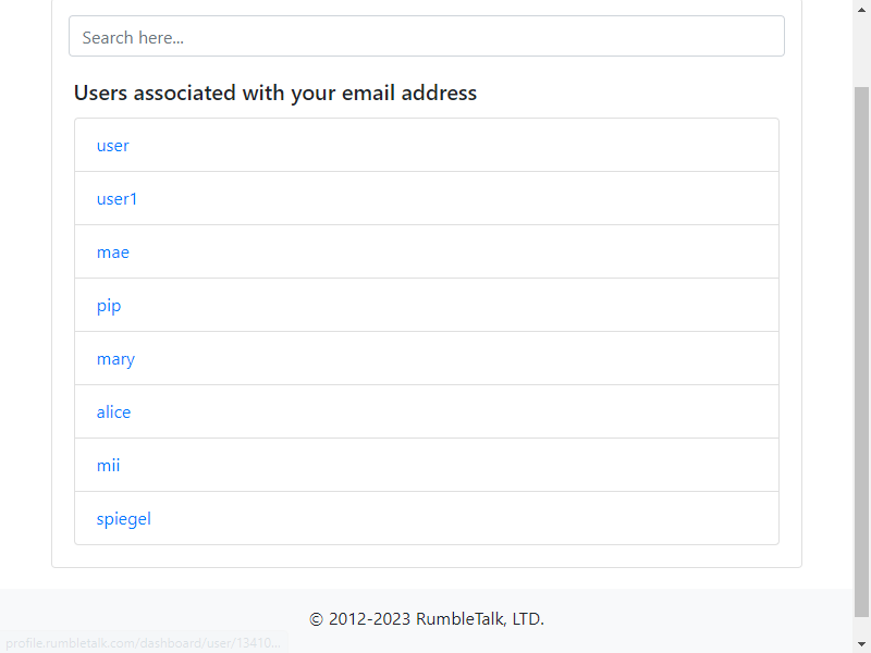 To delete your profile, go to https://profile.rumbletalk.com/access. This will give you access to your RumbleTalk users, which will be sent to your email. You can then delete any usernames associated with your account.