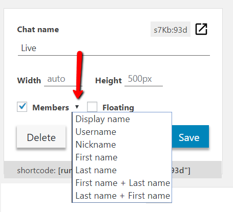 After installing the chat plugin, you will see a new black arrow next to the member’s field, simply choose the option you like or leave it to use the default name.