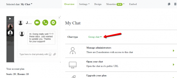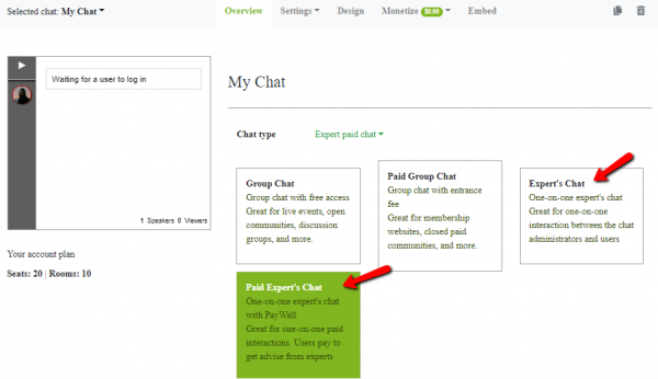 - Change your chat type to expert’s chat/paid expert’s chat. To do this, in the new admin panel, you will see “Chat type.” Click that and you will see all the different types of chat. Choose from “Expert’s chat” or “Paid expert’s chat.”