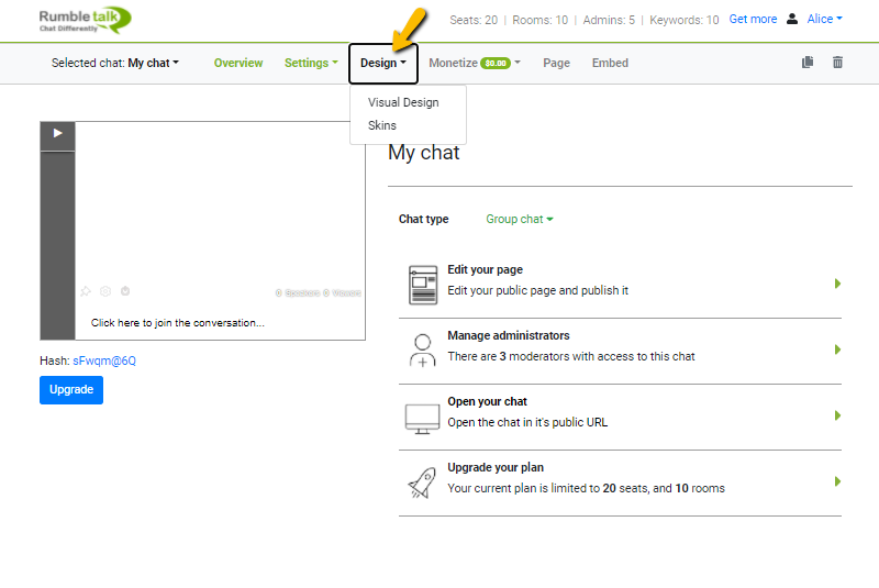 At the upper-most row, you will see the RumbleTalk logo; the number of seats, rooms, admins, and keywords; the upgrade page; and your username.