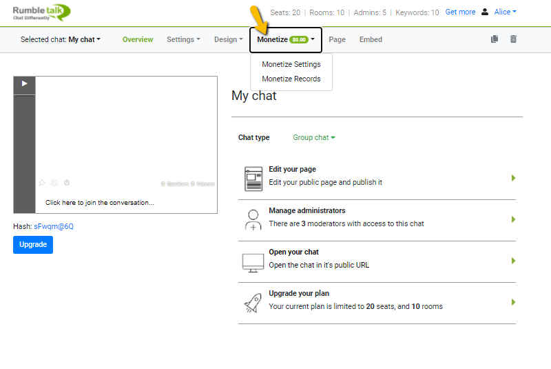 - Monetize Settings – This lets you enable the various monetization options for your chat rooms, such as donations, payment requests, and paywall.