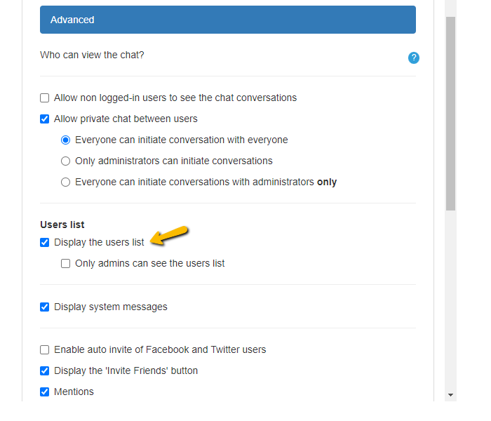 - Check the For administrators only checkbox under Display the users list if you want to hide the user’s list from non-admin users. To hide it for everyone, uncheck the Display the users list checkbox.