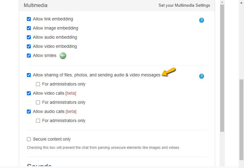 - Tick the box “Allow sharing of files, photos, and sending audio & video messages.”