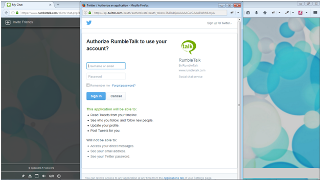 Once you created a user name with the exact name of your twitter or Facebook name. Select the “facebook” or “twitter” option, and a screen will pop up inviting you to enter your facebook or twitter credentials.