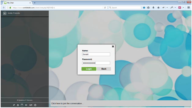 Select the “RumbleTalk” option (as the admin user you can change the name RumbleTalk to your own name), and simply use the chat room admin credentials provided to you or created in the User Management panel. Remember, the admin username you have created is case sensitive. Simply enter it here and you’re in!