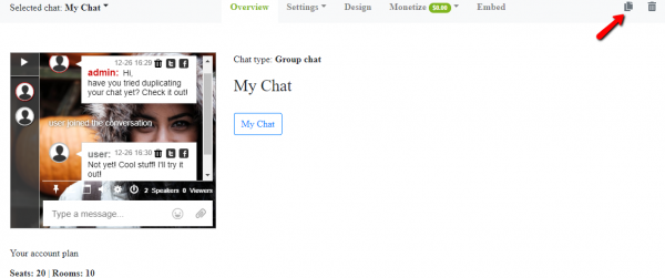 < Back You are here: KB Home 3. Admin Panel How to duplicate a chat? Print How to duplicate a chat? UpdatedMarch 3, 2026 If you need to duplicate a chat including the design, the settings, and even the banned IP list, you can do it with a click. Click on the top right duplicate icon and follow the instructions. Here’s a short video that can serve as a guide. Watch this video on YouTube
