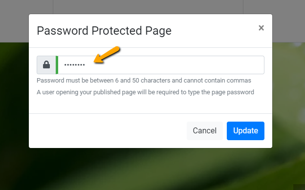 Your password must be between 6 and 50 characters and cannot contain commas. Any user opening your published page will be required to type it before they can access your page.