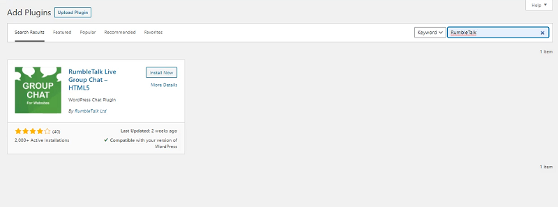 Search for the keyword RumbleTalk, and then click Install Now beside the RumbleTalk Live Group Chat – HTML5.