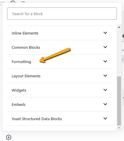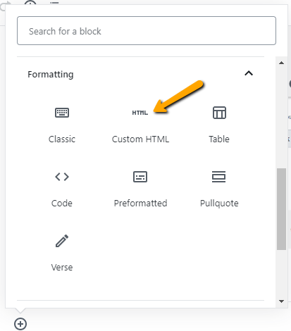 - Choose “Formatting.” Then, choose “Custom HTML.”