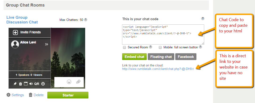 - URL – Even if you do not own a website, you can still use RumbleTalk group chat, you simply get a link to your chat that can be shared with your team. Get your direct chat link (see it here).