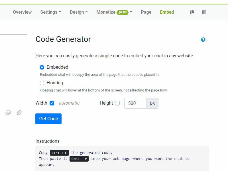 ● Floating embed – clicking on the checkbox floating, will let you add the chat as a floating toolbar chat
