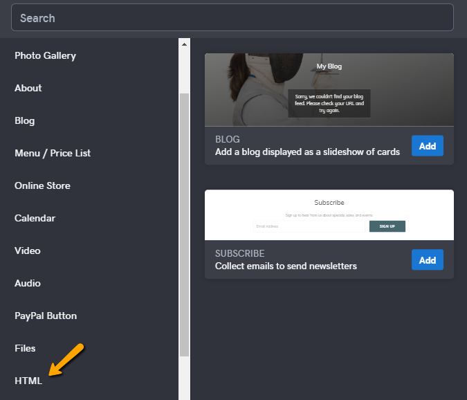 - Select “Add Section” and choose “HTML.”