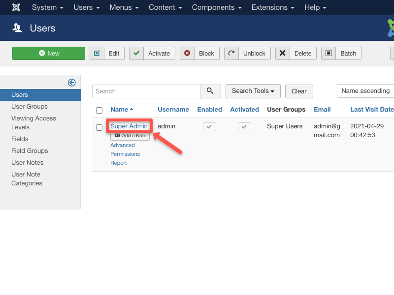 - Go to the Joomla administrator panel and log in with your Super Admin account.