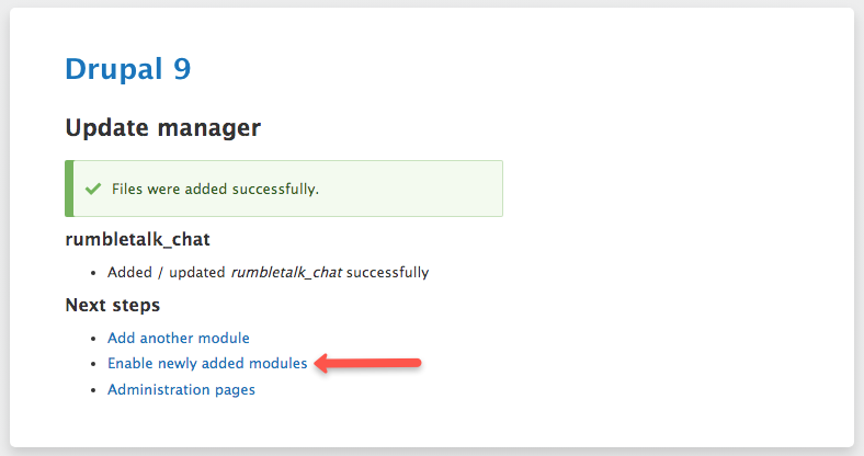 After Drupal loads the Module, it will bring you to the Update Manager page, which will give you the options. Enable the RumbleTalk Module by clicking Enable newly added modules.