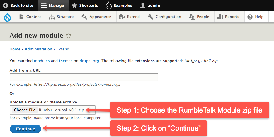 On the Add new module page, you can add a new module to be used on your Drupal website. Click on the Choose File button, and then click Continue.