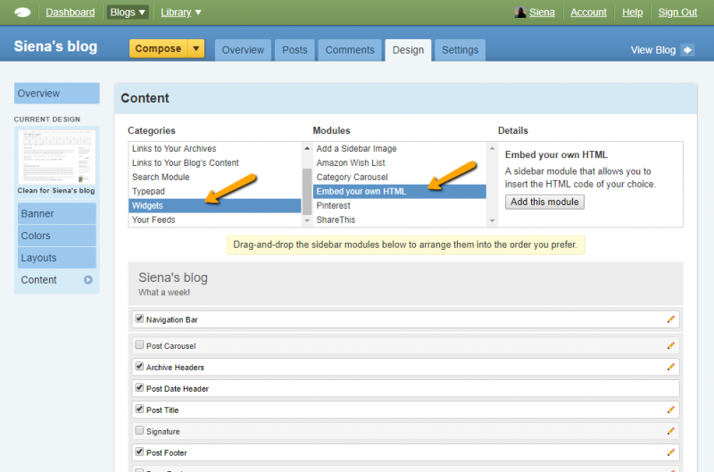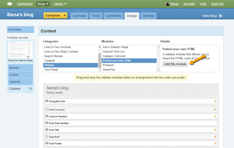 - Add the module: “Widget->Embed your own HTML.”