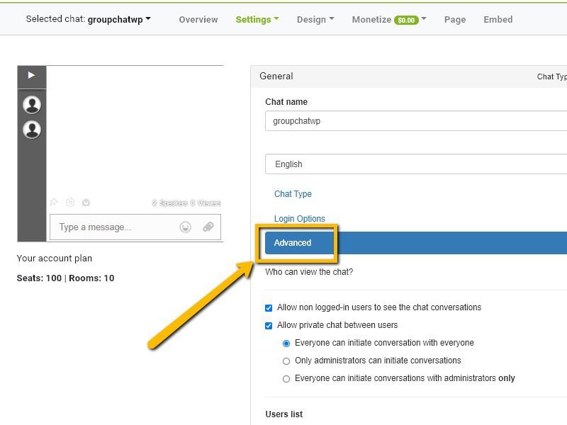 - First, access your RumbleTalk admin panel and click Settings.