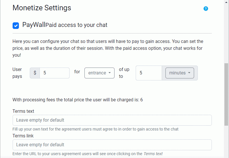 If you’re using paywall on your chat room, you have two options. It’s either users pay for entrance or they pay for subscription.
