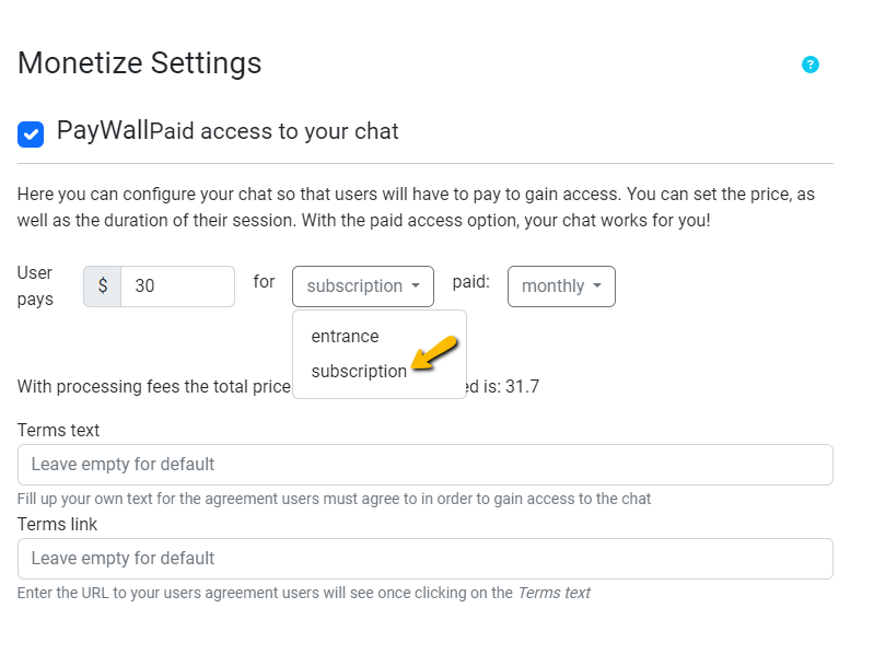 You can set your chat to collect an entrance fee. If you want to collect subscription payments from your audience, you need to enable monetize (PayWall) on your admin panel.