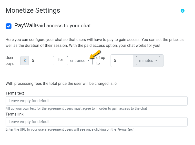To charge a fee for entering your chat, use the paywall feature in your chat room, just activate it via the Monetize settings.