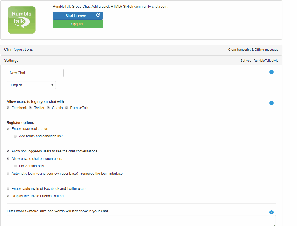 Simply open the chat admin panel and click on "Settings". One can change and customize the look & feel, set chat filters, place the chat in offline mode, advanced users management, control the chat behavior, ban users, export the chat room transcript, integrate with external users base, and more.