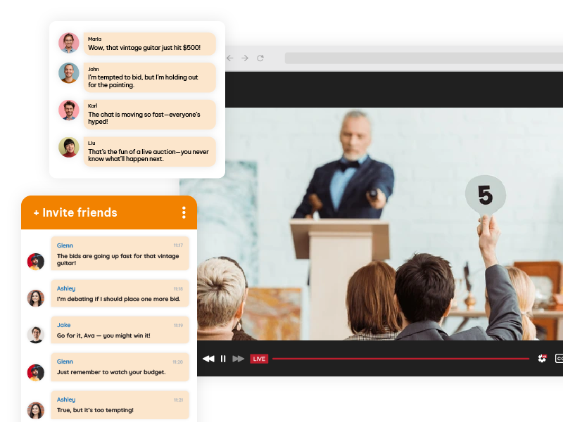 Having multiple participants chatting in a live room creates a sense of energy and authenticity. It mimics the feeling of being in a real auction room.