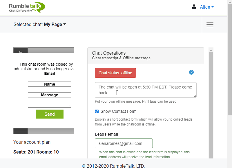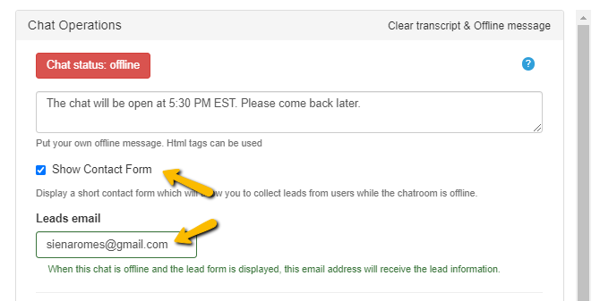 When you chat is offline, you can show a contact form where your users can reach you.