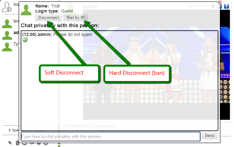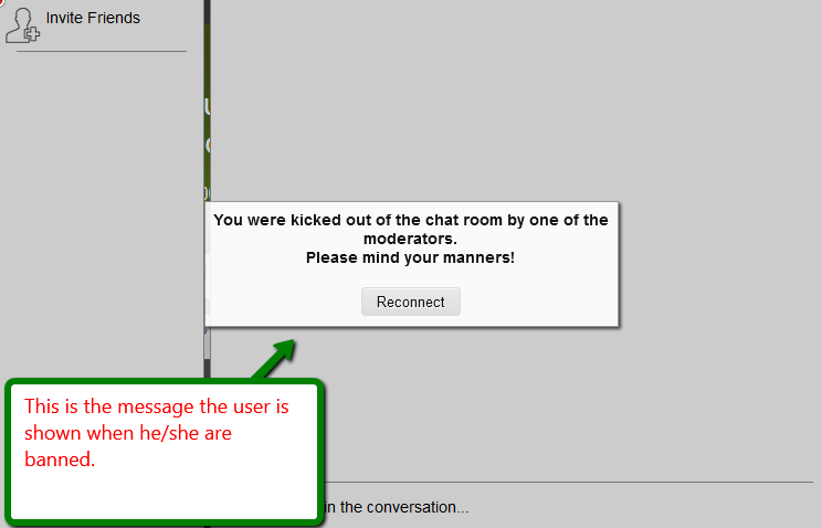 After 2 seconds from disconnecting, the user can return to the chat room, but he is considered as being warned. In case the person is still not behaving and act as a troll (spamming in the chat room), he then can be banned by IP. This is a hard ban where a user cannot return to the chat from the same computer (IP ban).