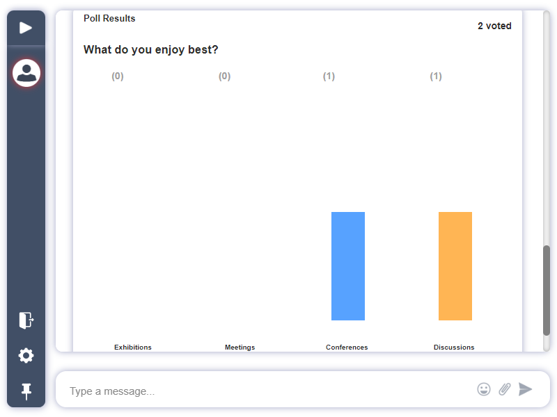 All result displays will show the number of participants that voted and what answer they chose. When publishing answers of chat polls, all logged in users will see them as it will pop-up on their screens.