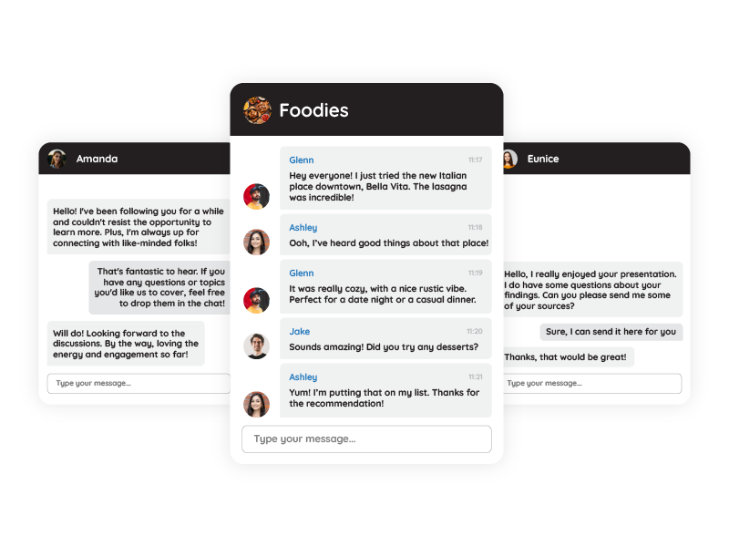- Embedded Widgets: Easily embed chat widgets into websites or apps, providing participants with direct access to communication features.