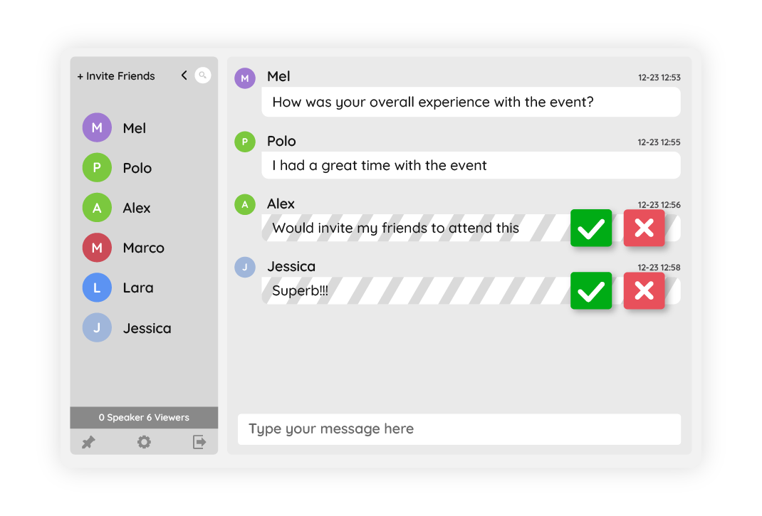 In this setup, every message sent by a participant is first reviewed by an admin before it appears in the chat. This guarantees that only appropriate and relevant messages are displayed. Pre-approval is particularly effective for high-stakes events, such as corporate webinars or industry conferences, where maintaining a professional atmosphere is critical. - Post-Approval Moderation: