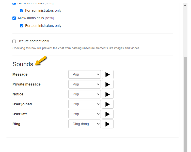 In the list below, you will learn what type of sounds you can control via the RumbleTalk chat room admin panel.