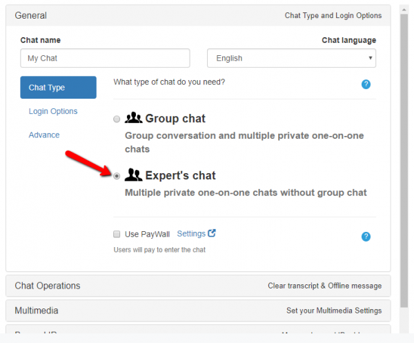 In your admin panel, you will see “Chat Type,” where there are options for the group chat or expert chat. Choose “Expert’s Chat.”