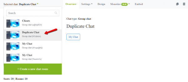 And voila, you have duplicated your chat design! Now, you can see your duplicated chat in the list of chat rooms you have in “Selected chat.”