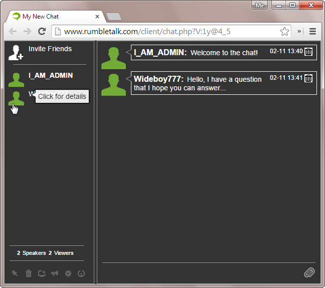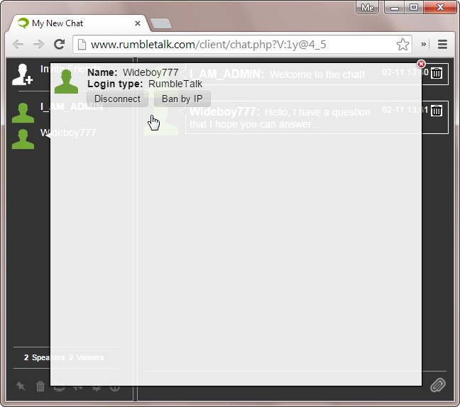 Ban by IP – this will remove the user from the chat, and disallow access from their current IP address. If the user was logged in with a RumbleTalk account, that account will be removed from the chatroom.